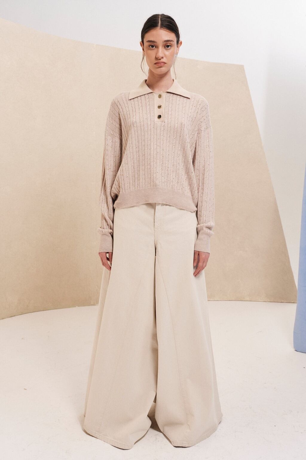 Este jean extra wide, con recortes en las piernas y lavado crudo, destaca por su estilo moderno y distintivo. Presenta una badana de cuero con foil plata y un botón marcario en color plateado.