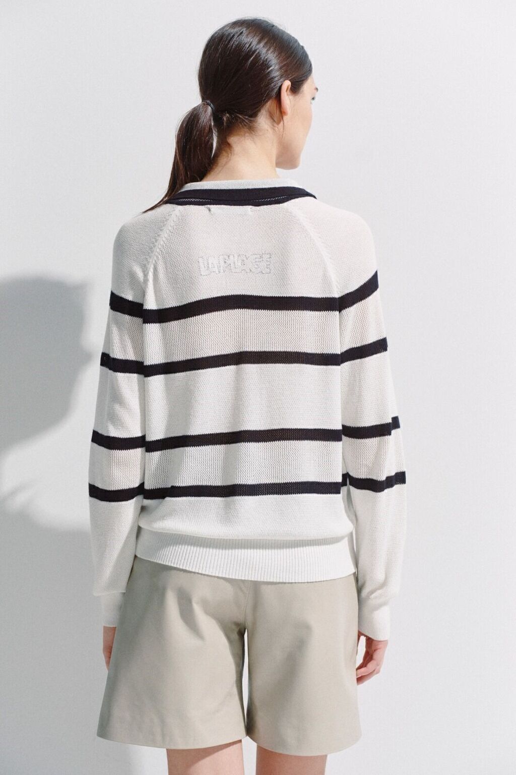 Sweater a rayas horizontales confeccionado en tejido liviano y desagujado. Presenta un cuello polo clásico y una cartera tejida en jersey, que aporta contraste de texturas.
