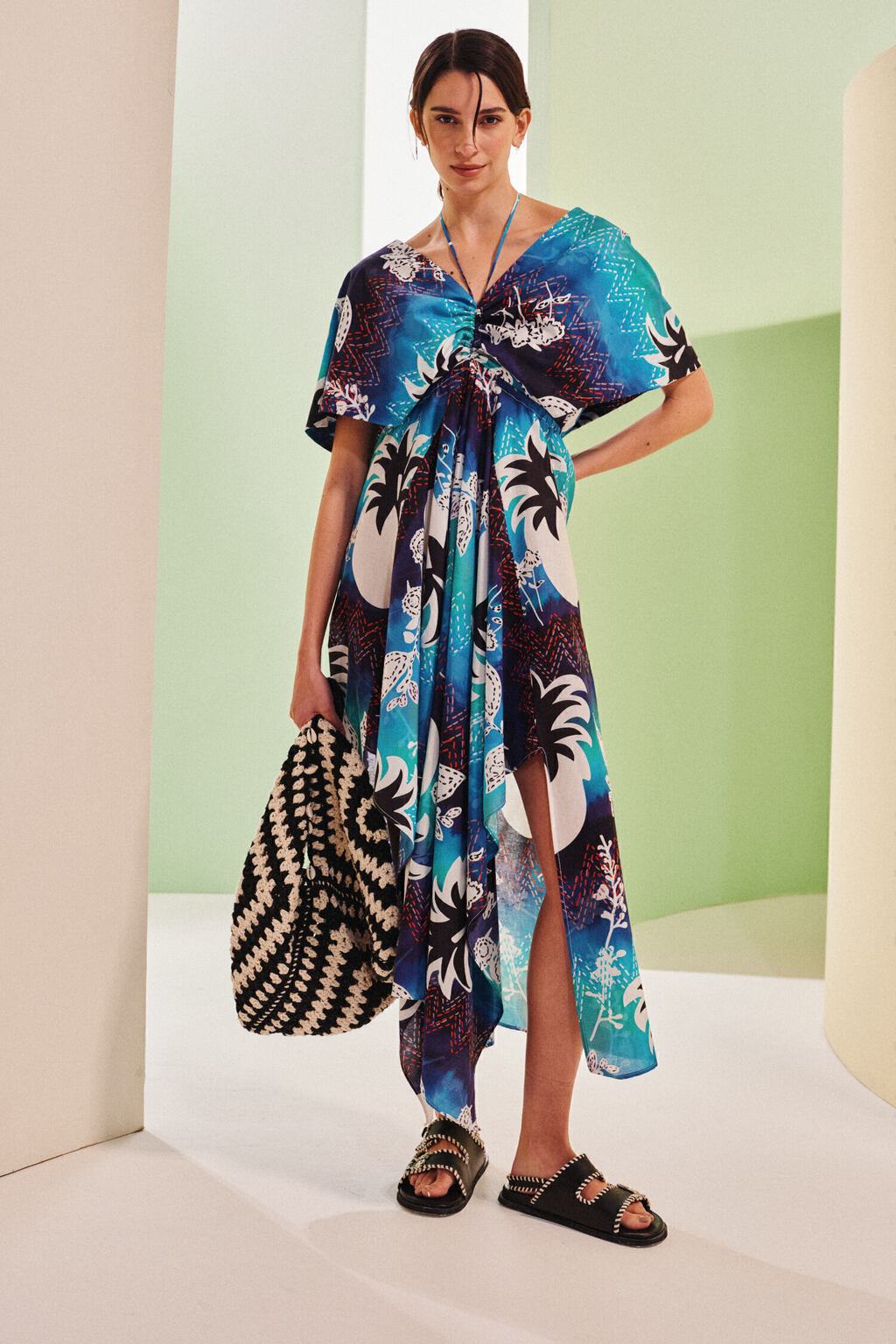Vestido con ruedo irregular confeccionado en voile cottonsilk estampado con el print Leblon", exclusivo de nuestra colección. Cuenta con una jareta en el escote delantero que se ata al cuello con resinas de colores combinados. La espalda es cruzada y lleva un tajo.