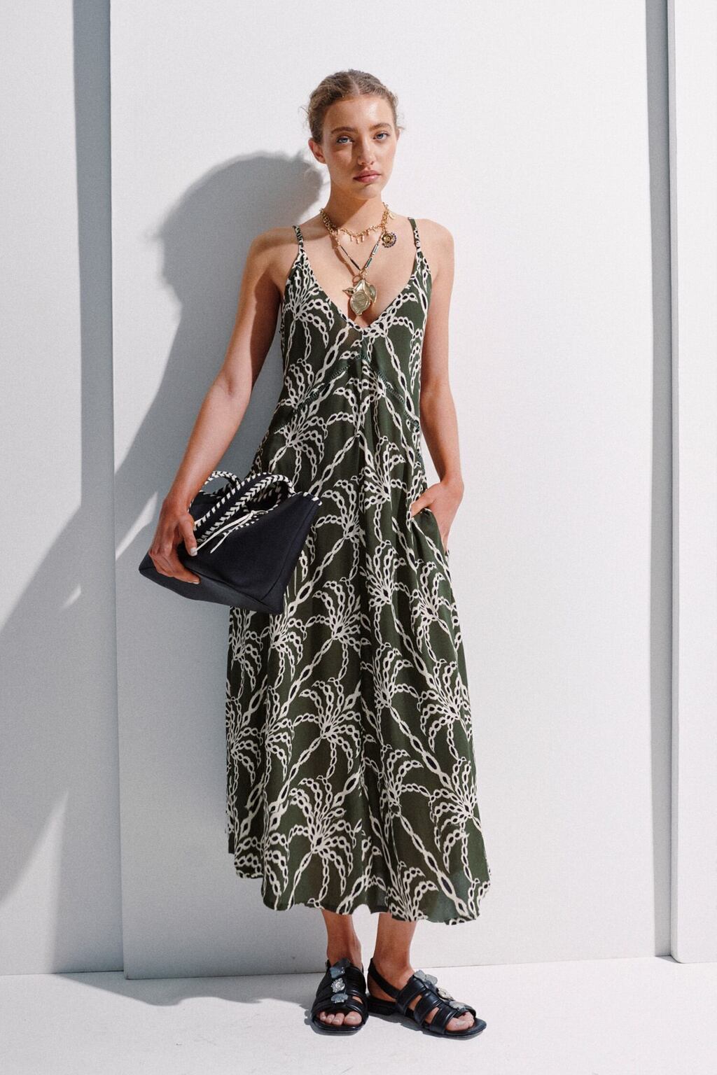 Vestido de largo midi confeccionado en viscosa liviano y con excelente caída, estampado con el print exclusivo Amazonia, desarrollado especialmente por Justa Petra. Presenta escote en V con detalle de entredos que aporta delicadeza y acento visual al diseño. Cuenta con breteles regulables que permiten un ajuste personalizado.